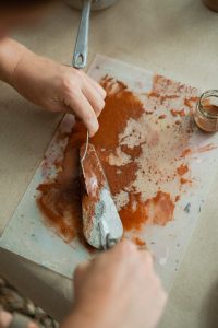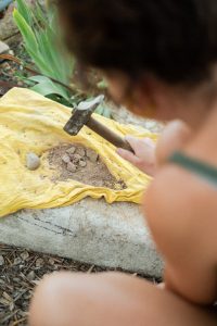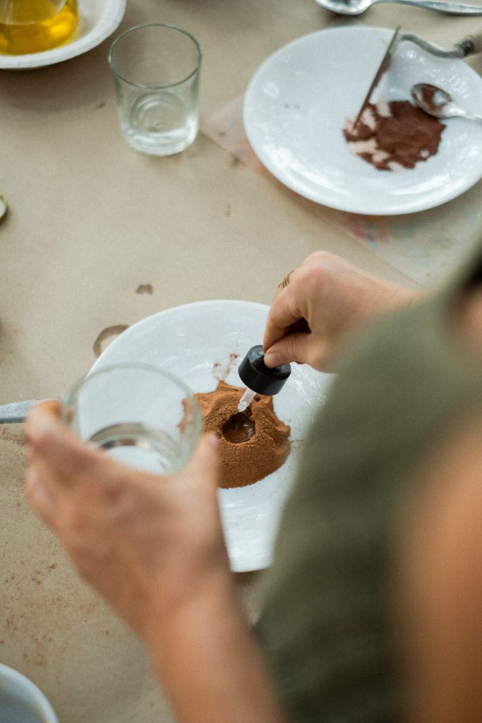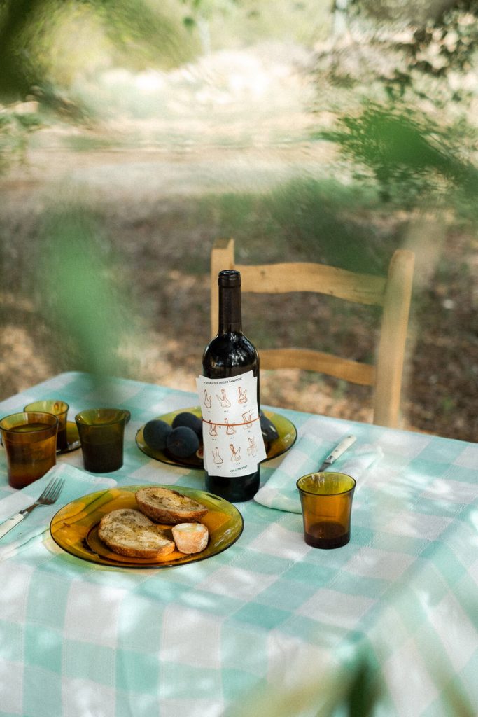 A partir de l’argila vermella de les vinyes on creix la Carinyena s’ha extret un tint natural que determina la cromàtica rogenca amb què s’han il·lustrat les figures de l’etiqueta.